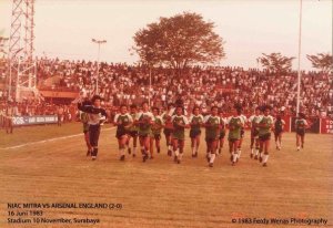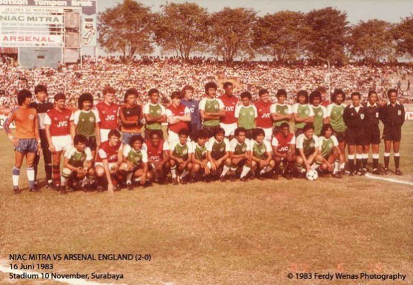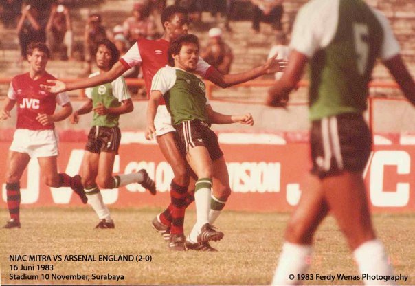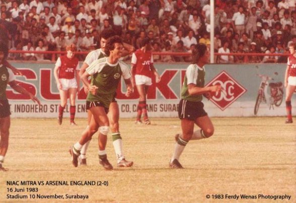 Kompas 17 Juni 1983. Niac Mitra 2, Arsenal 0. Niac Mitra mengukir kenangan indah lagi di depan ribuan penggemarnya di Stadion Gelora 10 Nopember ketika sore kemarin agak diluar dugaan menaklukan klub kenamaan Inggris, Arsenal, dengan kemenangan mutlak 2-0 (1-0).